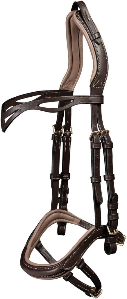Die anatomische Konstruktion der Trense, einschließlich eines speziell geformten Genickstücks und eines breiten Nasenriemens, sorgt für eine komfortable Passform, die Druckstellen minimiert. Sowohl das Genickstück als auch der Nasenriemen sind dick und weich unterlegt, um dem Pferd zusätzlichen Komfort zu bieten. Die rundgenähten Backenstücke und Kehlriemen tragen weiterhin dazu bei, Druckpunkte zu vermindern und die Trense angenehm zu machen.